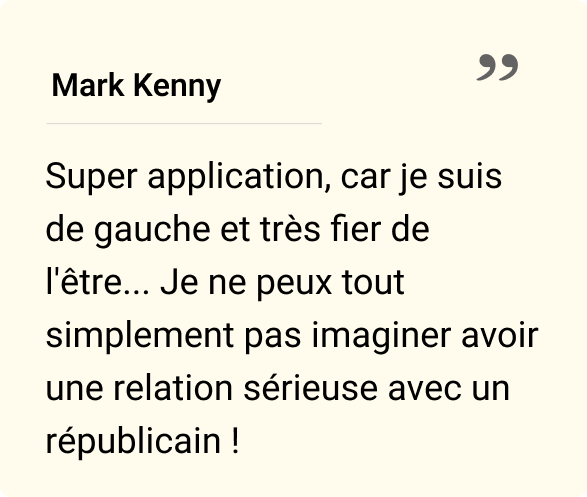 Commencez votre prochaine relation sur des bases communes. Avec Fyra, vous pouvez vous connecter avec des personnes qui partagent vos valeurs, telles que l’égalité sociale, le respect de la diversité, les droits humains et la durabilité. Créez une relation significative en sachant que vous vous souciez tous les deux des choses qui comptent vraiment. Les relations rencontrent souvent des défis lorsque les partenaires ont des convictions politiques opposées. Fyra vous aide à éviter ce stress inutile en vous présentant quelqu’un qui partage vos idéaux. Trouvez votre partenaire progressiste dès aujourd’hui – installez maintenant!